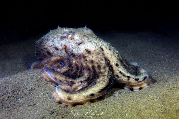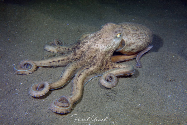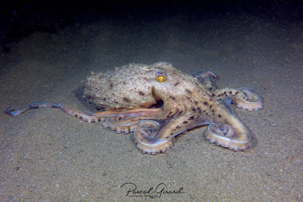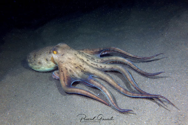 Deux individus observés lors d'une plongée de nuit à Carnon dans l'Hérault. Une rencontre rare avec ce poulpe de sable au comportement très particulier.