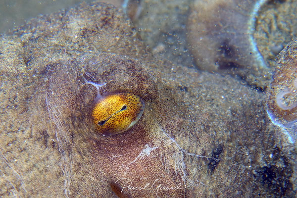 Regardez bien son oeil avec sa pupille horizontale en comparaison avec celui de la seiche qui a une pupille en "W".