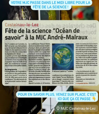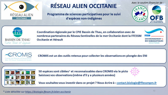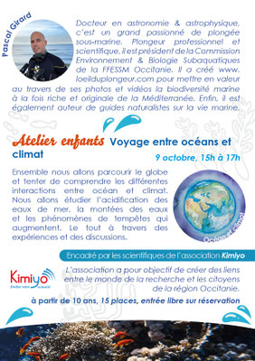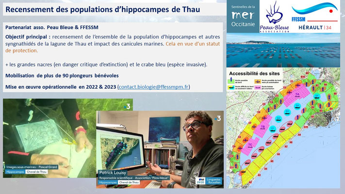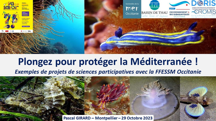 Une journée de co-animation du stand CPIE Basin de Thau/Sentinelles de la mer Occitanie et une conférence sur les outils (DORIS & CROMIS) et missions de sciences participatives auquel la FFESSM Occitanie pilote ou contribue (réseau ALIEN Occitanie, Hippo-Thau avec Peau-Bleu, grandes nacres de Thau, suivi scientifique compl. de la réserve de Porquières, suivi de la biodiversité de l'Espiguette avec le Seaquarium...)