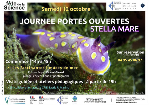 Conférence organisée par la plateforme Stella Mare de l'Université de Corse/CNRS pour la fête de la science. Une salle comble (et magnifique avec ses aquariums !) pour un voyage à la découverte des incroyables limaces de mer Méditerranée !