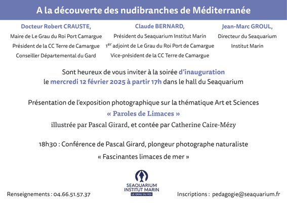 Exposition "Paroles de limaces" avec le SEAQUARIUM Institut Marin au Grau-du-Roi. Du 12 février à fin août 2025.