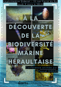 Conférence sur la biodiversité sous-marine héraultaise organisée par l'Ecole de Gestion de Protection de la Nature (EGPN Montpellier). Avec le concours de l'association Fiber Nature qui a diffusé l'événement en direct sur YouTube (replay ci-dessous).